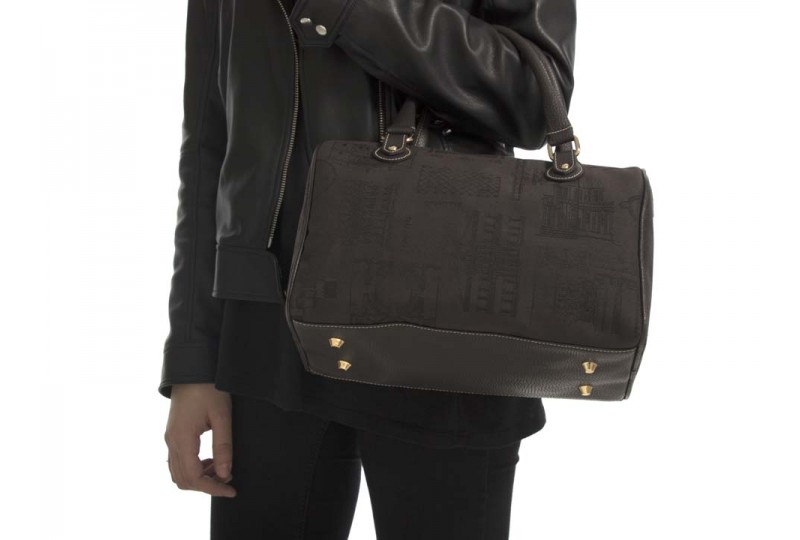 Duffel hand bag, roomy and easy to wear with. Tapestry tissue and contrasting leather details.Bottom, trim and handles in real leather. Metallic accessories. Internal security pocket with zip closure and 2 more for small objecta or cell.