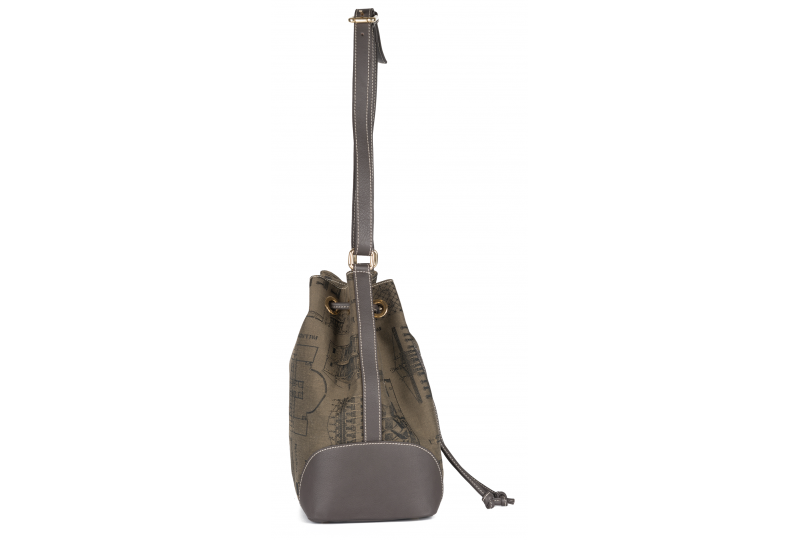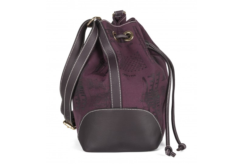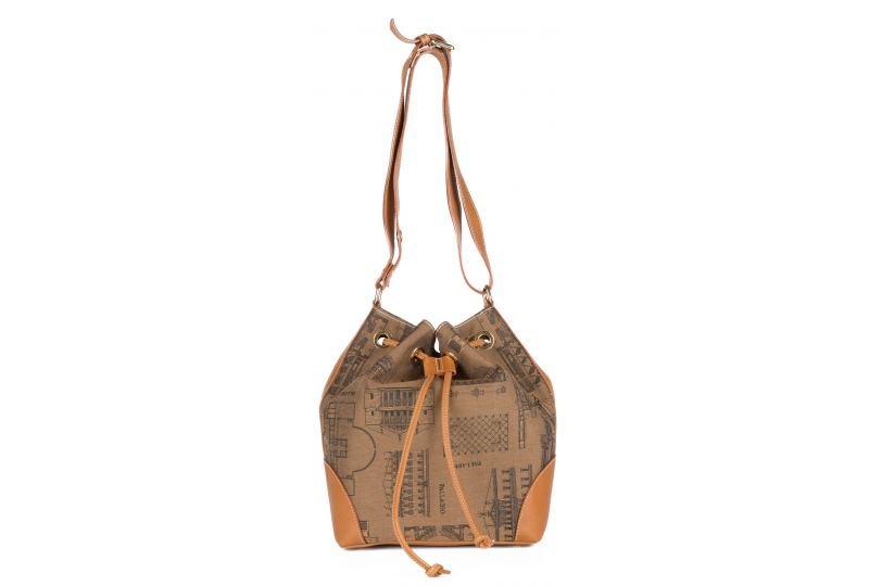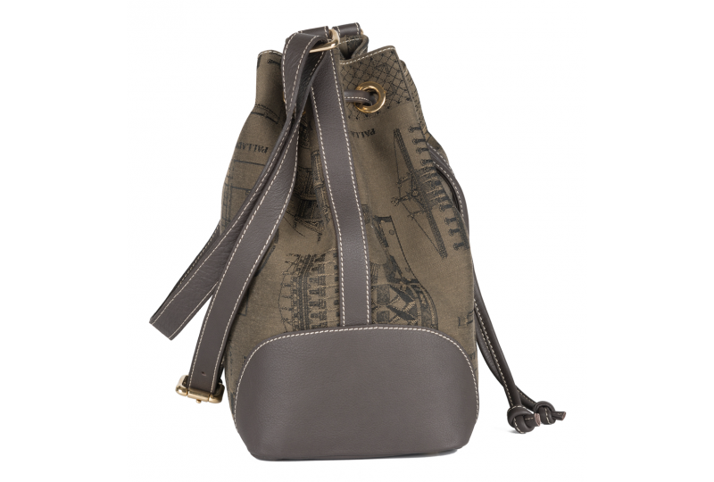 Practical shoulder bag with bottom and other details in fine leather. Internal lining with security zipped pocket and 2 small pockets. Metal accessories. Leather drawstring closure.