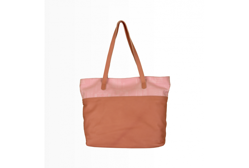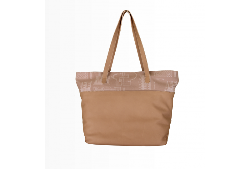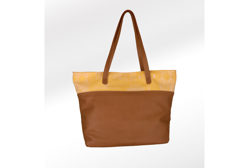 Elegant shopper bag all-leather with a tapestry tissue top band and leather handles Internally devided in 2 cases by a security pocket with zip closure and 2 more forsmartphone or other objects.